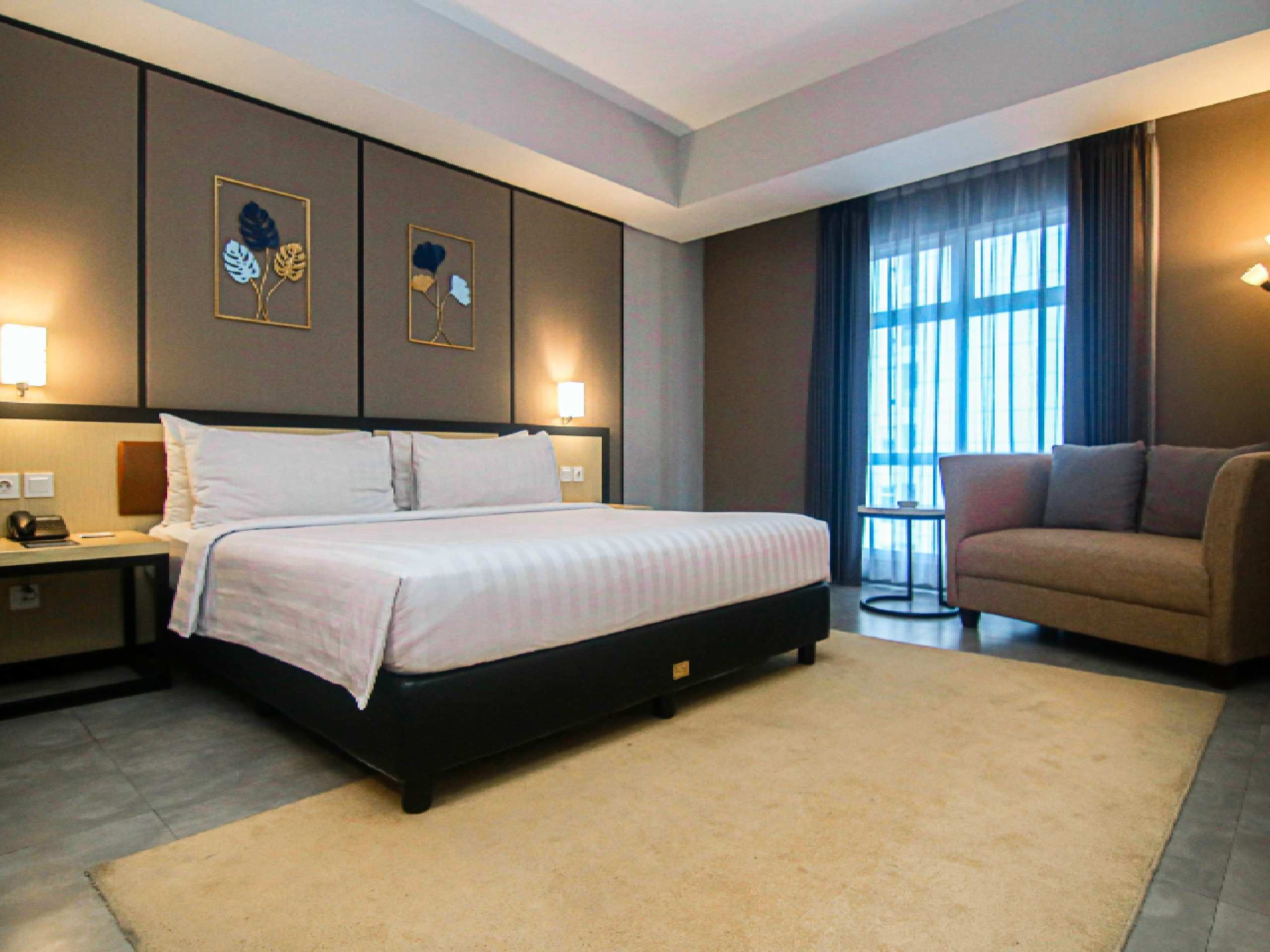 Hotel room type with exclusive benefits, spacious living room, work desk, equipped with King Size bed, and 2 bathroom with shower. This room have a river, rice field, and hill view.